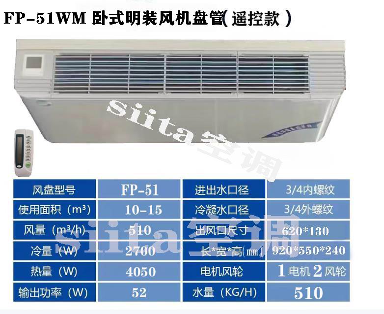 FP-51WM 是臥式明裝風機盤管,額外風量 510m3/h,適配 10-15㎡空間,低噪易裝、外觀適配裝飾,常用于住所、工作、商鋪等需靈敏溫控的場景。以下是具體參數與使用場景: